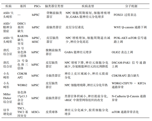 多能干细胞来源的脑类器官,尤其是患者特异性iPSC来源的脑类器官作为神经发育疾病的体外模型有巨大应用潜力。目前已有多个实验室利用脑类器官成功再现了胚胎早期发育中神经发育异常的相关表型(表1),其致病机制大多归因于神经祖细胞(neural progenitor cell, NPC)的细胞周期受阻、增殖和分化紊乱以及过早的神经分化和成熟等[4]。